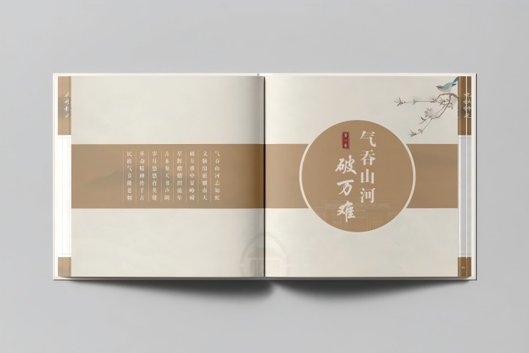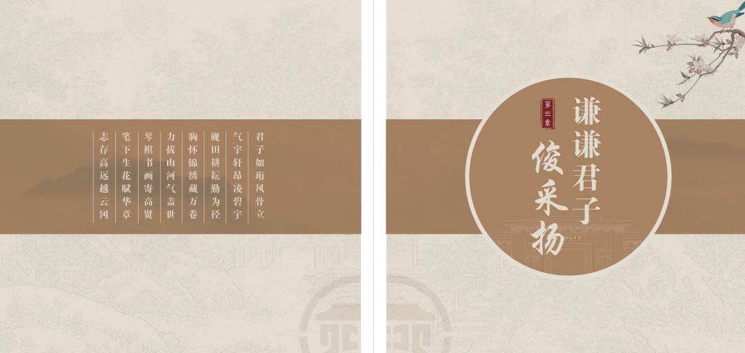 右侧圆形区域的主题大字与左侧内文形成“总分结构”:主题点明核心精神,内文以诗词细节诠释、延伸主题,让读者在“宏观意境+微观意象”的阅读中,自然接收内容的价值主张。