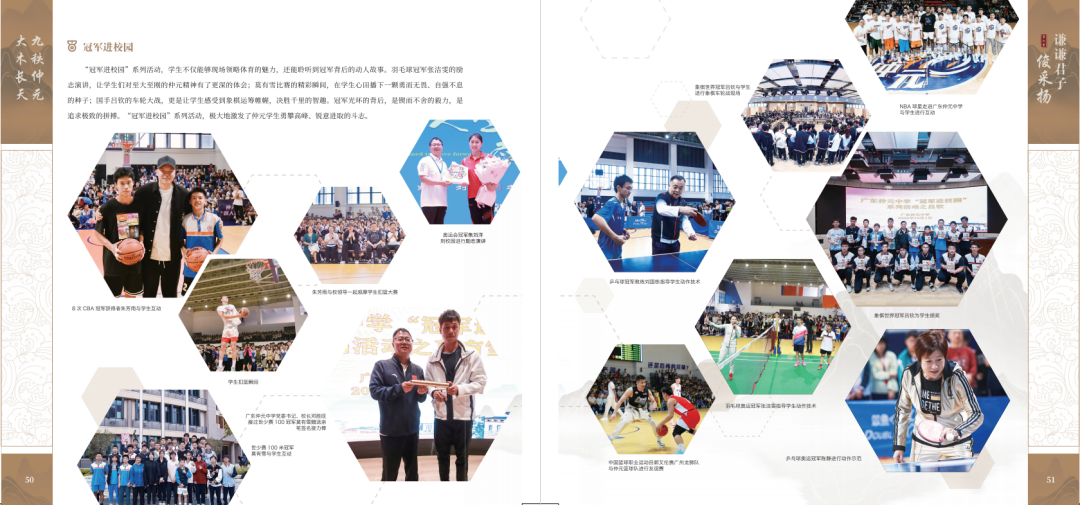 图片选取与排版凸显“时空对话”的巧思。老照片部分带着岁月斑驳感,直观呈现不同年代的校园生活;现代图景展现学校的发展活力,新旧对比中凸显“古树新芽”的传承意涵。排版上,章节内按“历史事件—人物故事—场景展示”递进,如“元基履迹”板块集中放置邓仲元手稿等文物图片,“力拔山河”板块则密集呈现体育赛事瞬间,图文节奏张弛有度,让读者在视觉流动中感受历史的厚重与青春的鲜活。