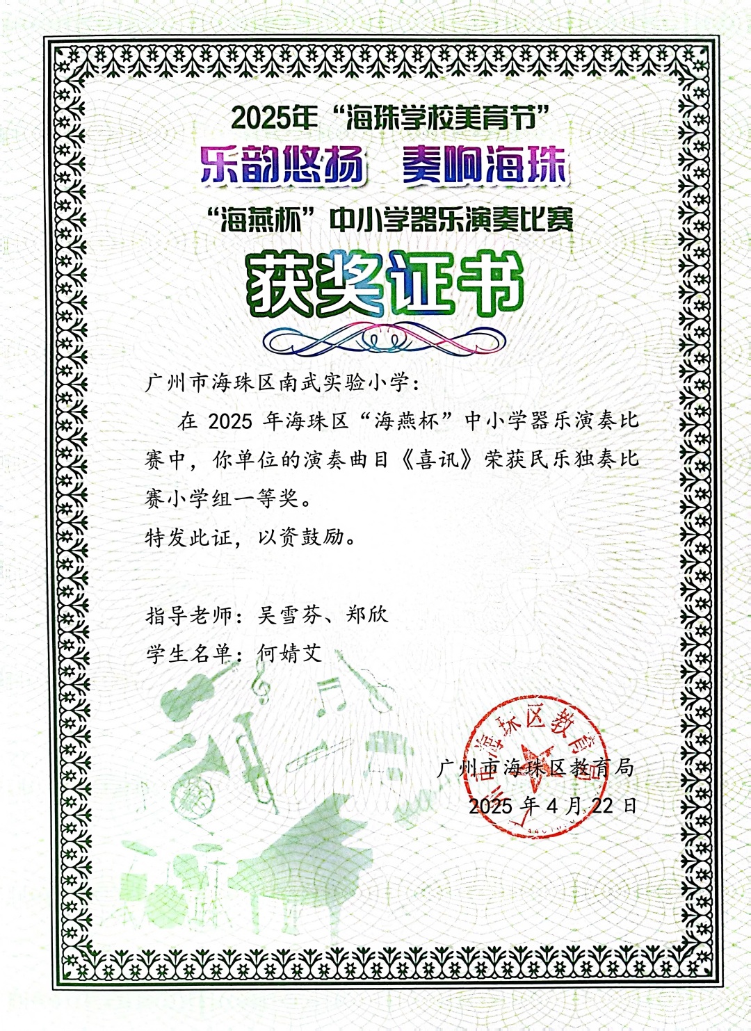 这位三年前连扬琴琴弦都认不全的女孩,此刻以流畅的演奏助力南实小民乐团拿下今年“羊城美育节”海珠区民乐独奏的一等奖,她的扬琴声,成了整首曲子里最亮眼的声部之一。