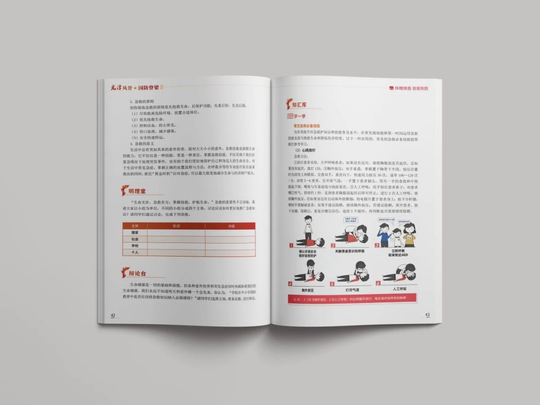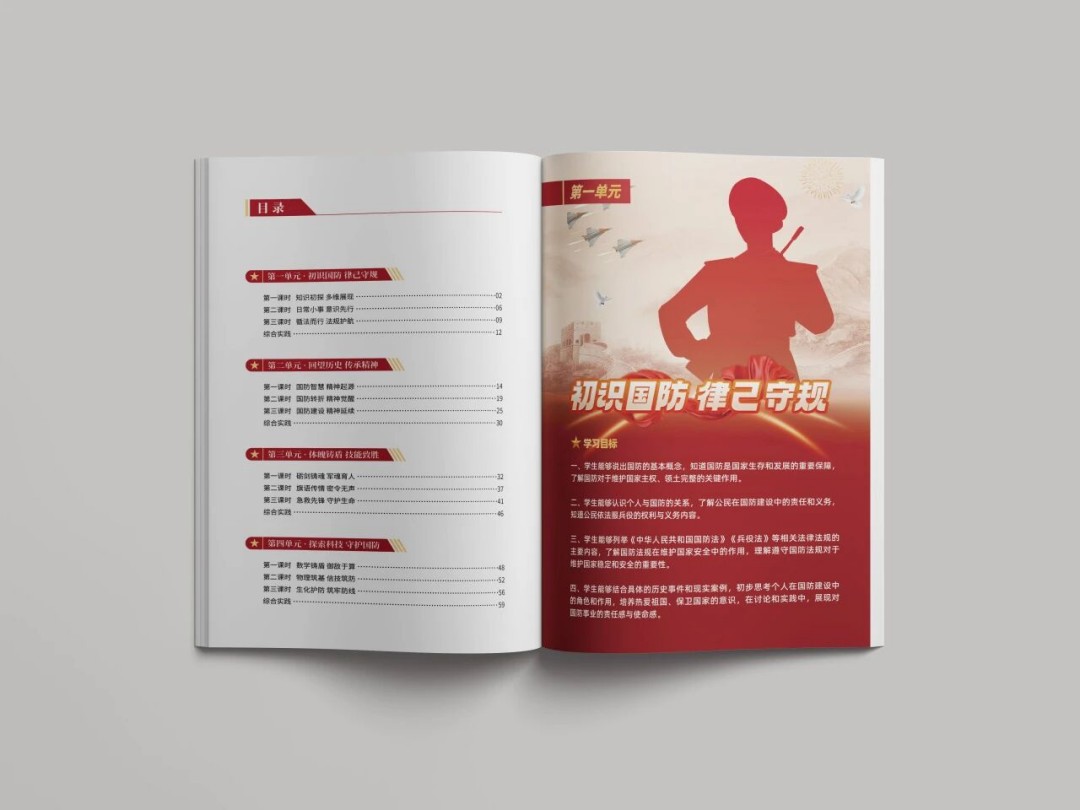 为了让读本独具特色,我拟定了与众不同的顶层设计理念。它超越了简单的军事知识普及,构建了全新的“大国防观”——国防不仅是军队的事,而是与每个公民的纪律意识、历史观、身体素质、实用技能和科学素养都息息相关。四个单元的设计遵循了培养“完整的人”的逻辑,从第一单元初识概念,培养认知;第二单元培育家国情怀;第三创新单元掌握实用技能;第四单元用科技赋能国防,指向未来和创新。四个单元搭配一项综合实践,精心的结构设计,形成了一个“知—情—意—行”的完整闭环。