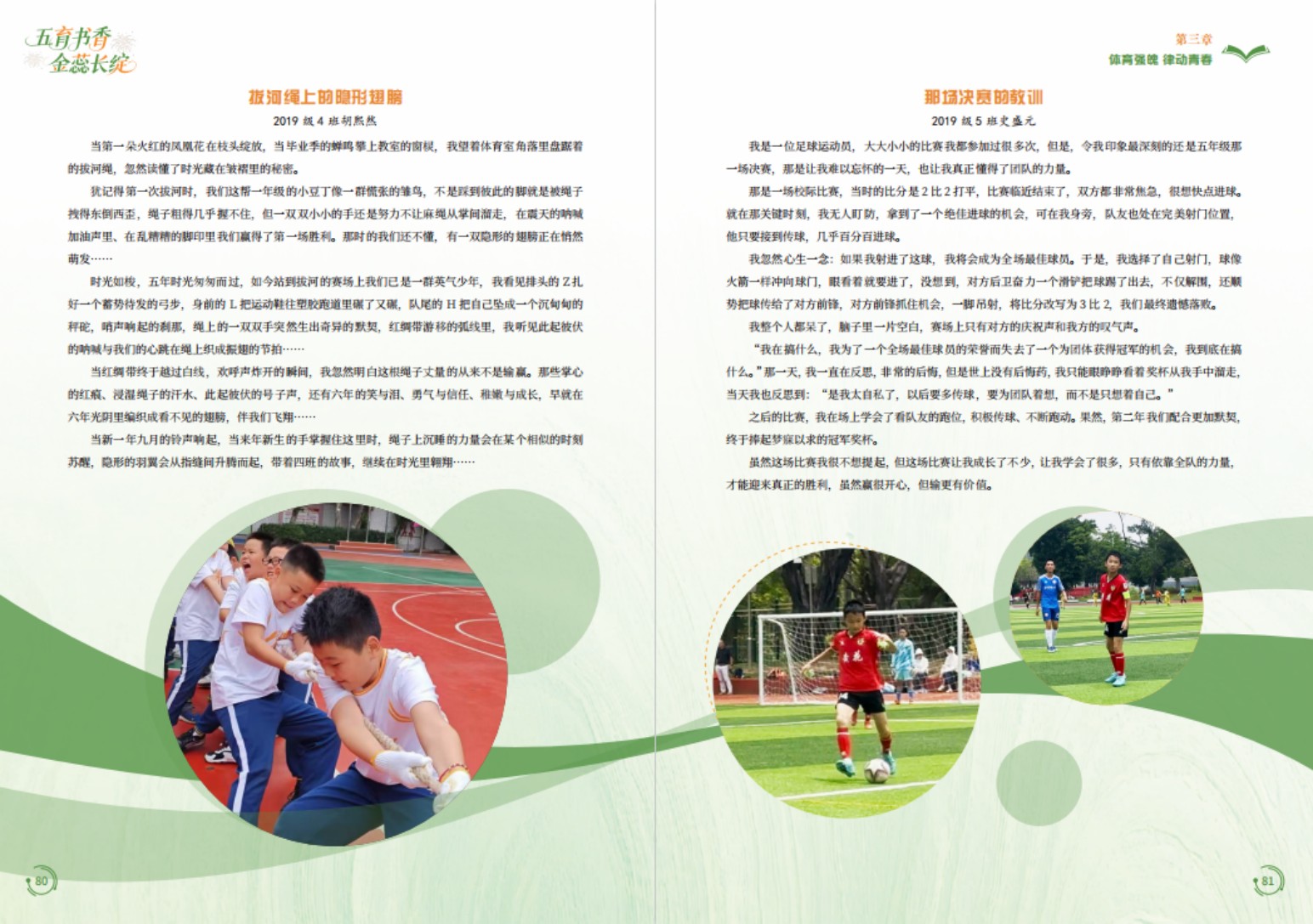 章节标题兼具韵律与辨识度,以“德育润心 文以载道”“智育启思 学海拾贝”“体育强魄 律动青春”“美育陶情 艺韵流芳”“劳育立行 实践真知”“全科融合 跨界绽放”为纲,既紧扣“五育并举”政策导向,又以“全科融合”收尾,形成“分述五育特色—总括融合成果”的逻辑链,呈现学校育人体系的完整性。