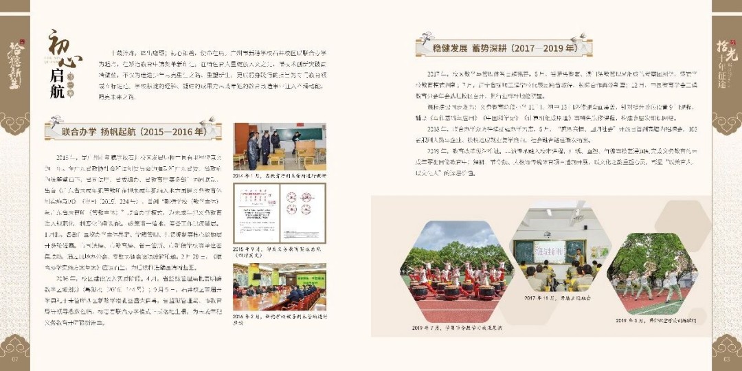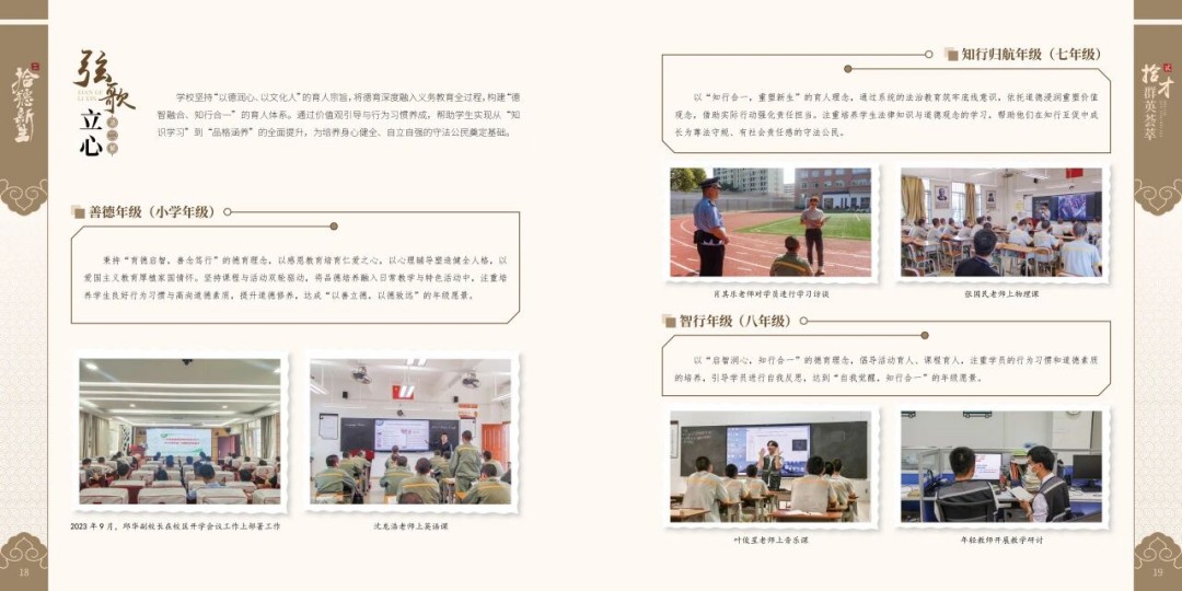 作为全册核心亮点,通过图文结合的方式记录了校区在扎实完成国家义务教育课程的基础上,深耕校本特色、拓展育人维度:学校引入舞狮、节令鼓等纪律与协作训练;开设广绣、沙画、掐丝珐琅等非遗课程,使学生在创造中习得专注、在技艺中沉淀心性。