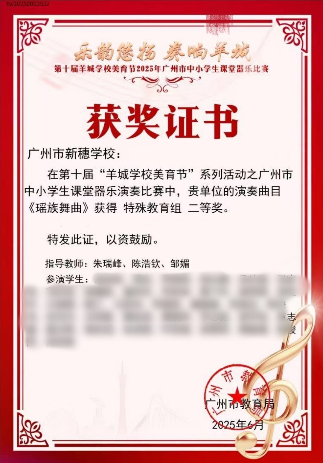 第十届“羊城美育节”广州市中小学生课堂乐器大赛,荣获市二等奖