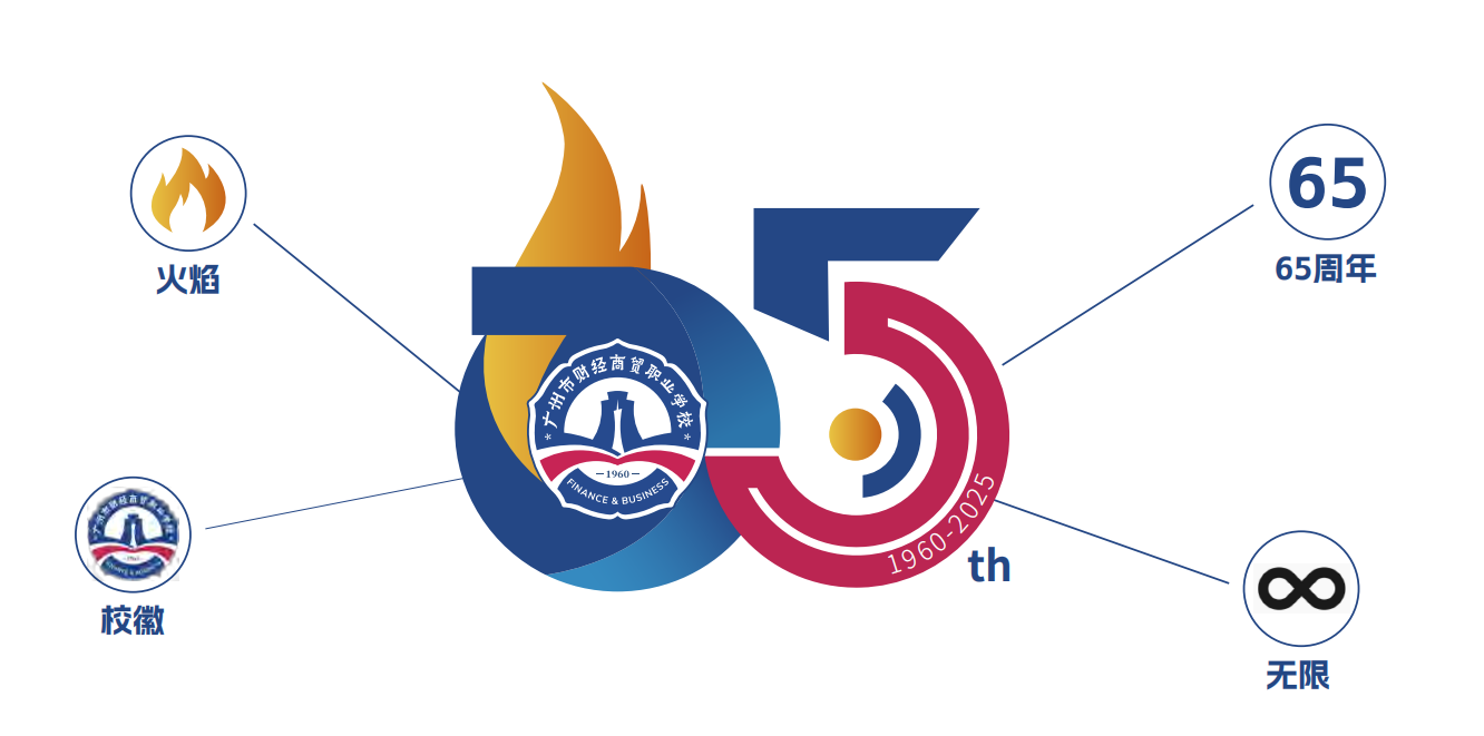 ● “65”的周年庆logo视觉符号搭配火焰、动态数字等元素,是我们对学校生命力的诠释——六十五岁的财贸职校,依旧朝气蓬勃、向上生长。