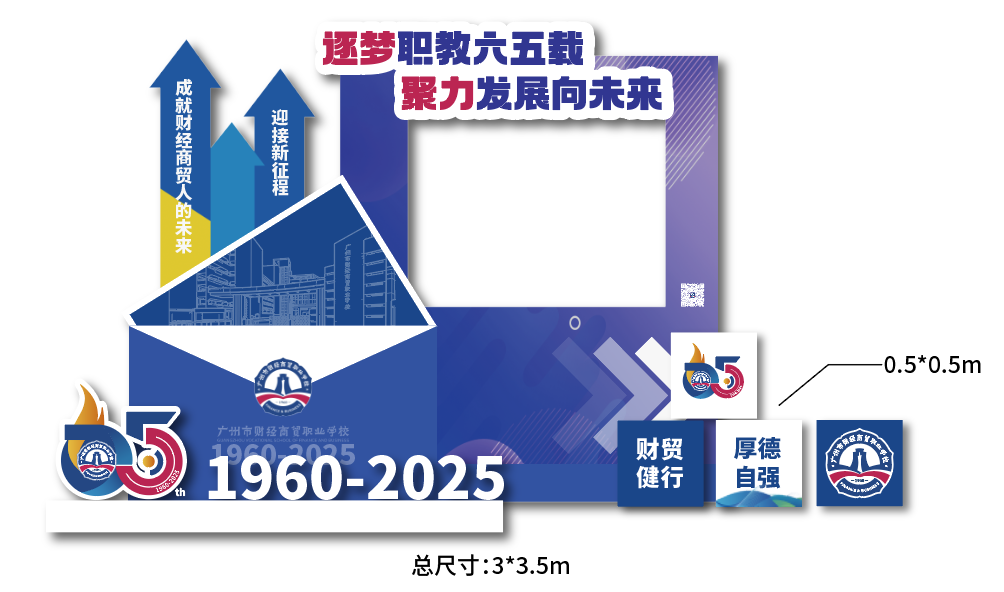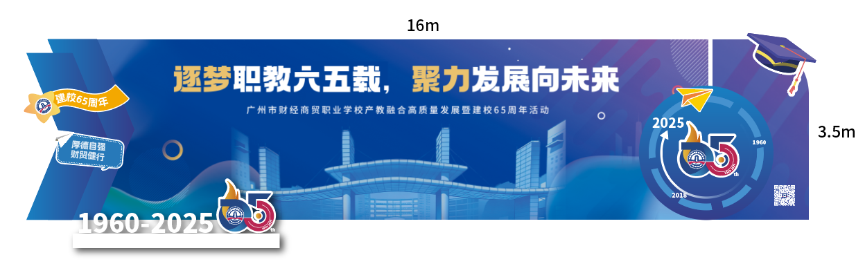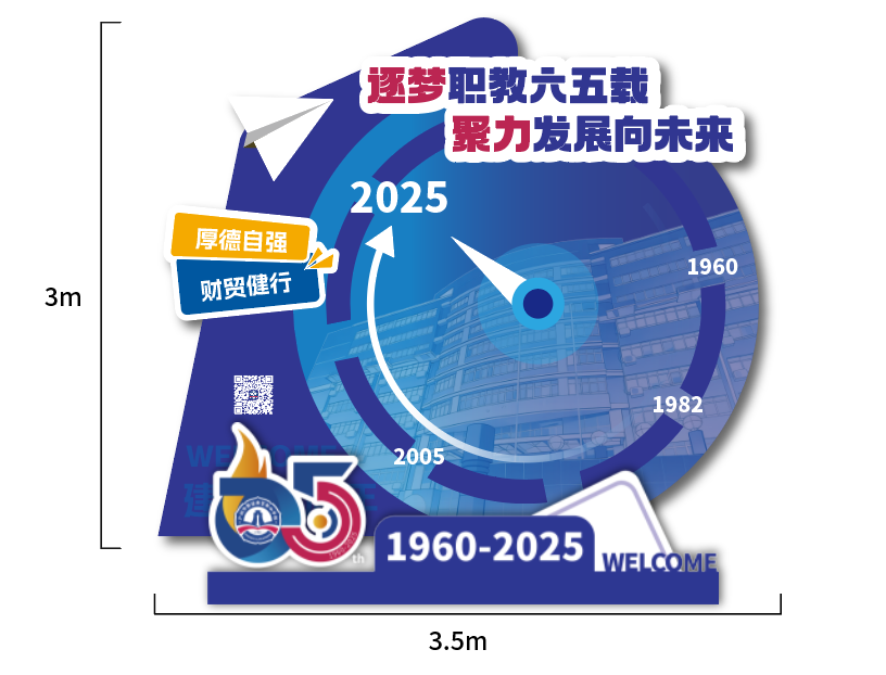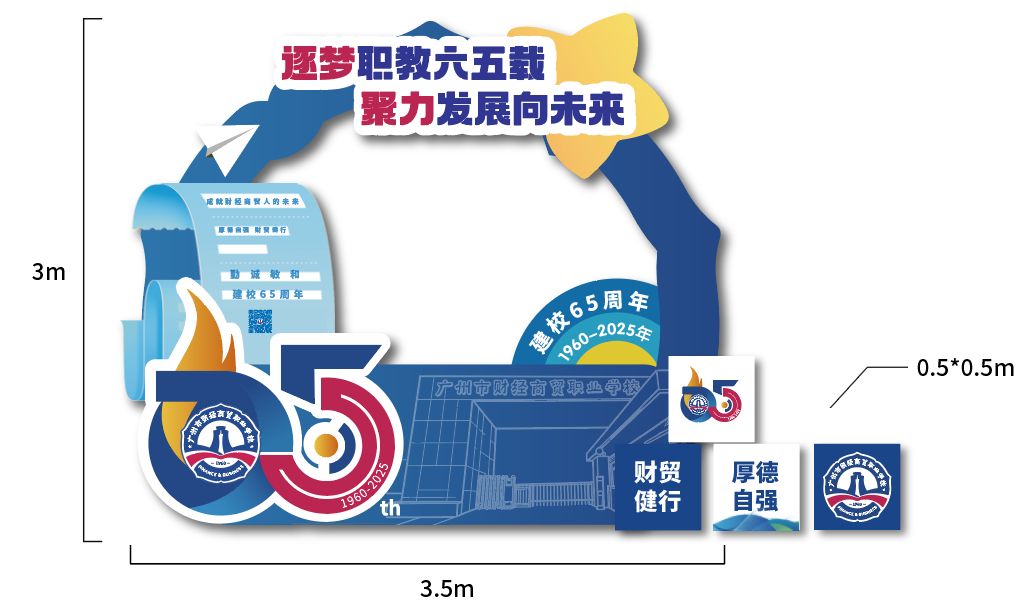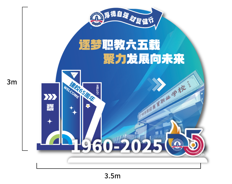 本次65周年校庆视觉设计,实现了学校文化与视觉美感的统一。设计时需要实地精测尺寸、适配材质,兼顾美观实用;安装中更需紧盯细节,校准成品偏差,确保设计高还原落地。这场视觉设计留下的不仅是美观实用的校庆物料,更传递着财贸职校“厚德自强 财贸健行”的精神内核与“逐梦向新”的蓬勃朝气。