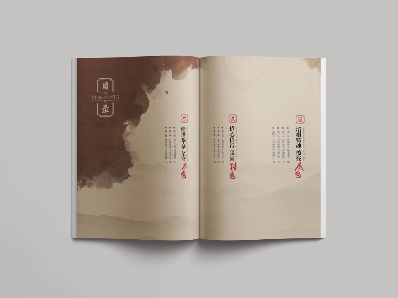 画册以“培根铸魂 擦亮底色”“侨心侨行 强固特色”“续谱华章 坚守本色”为三大篇章,目录清晰划分“桥接今昔”“三驾马车”等核心章节,形成“历史—办学—成果”的完整脉络。